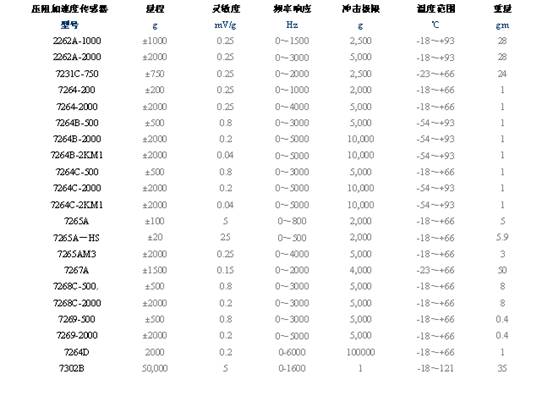 壓阻加速度傳感器 型號(hào) 2262A-1000 2262A-2000 7231C-750 7264-200 7264-2000 7264B-500